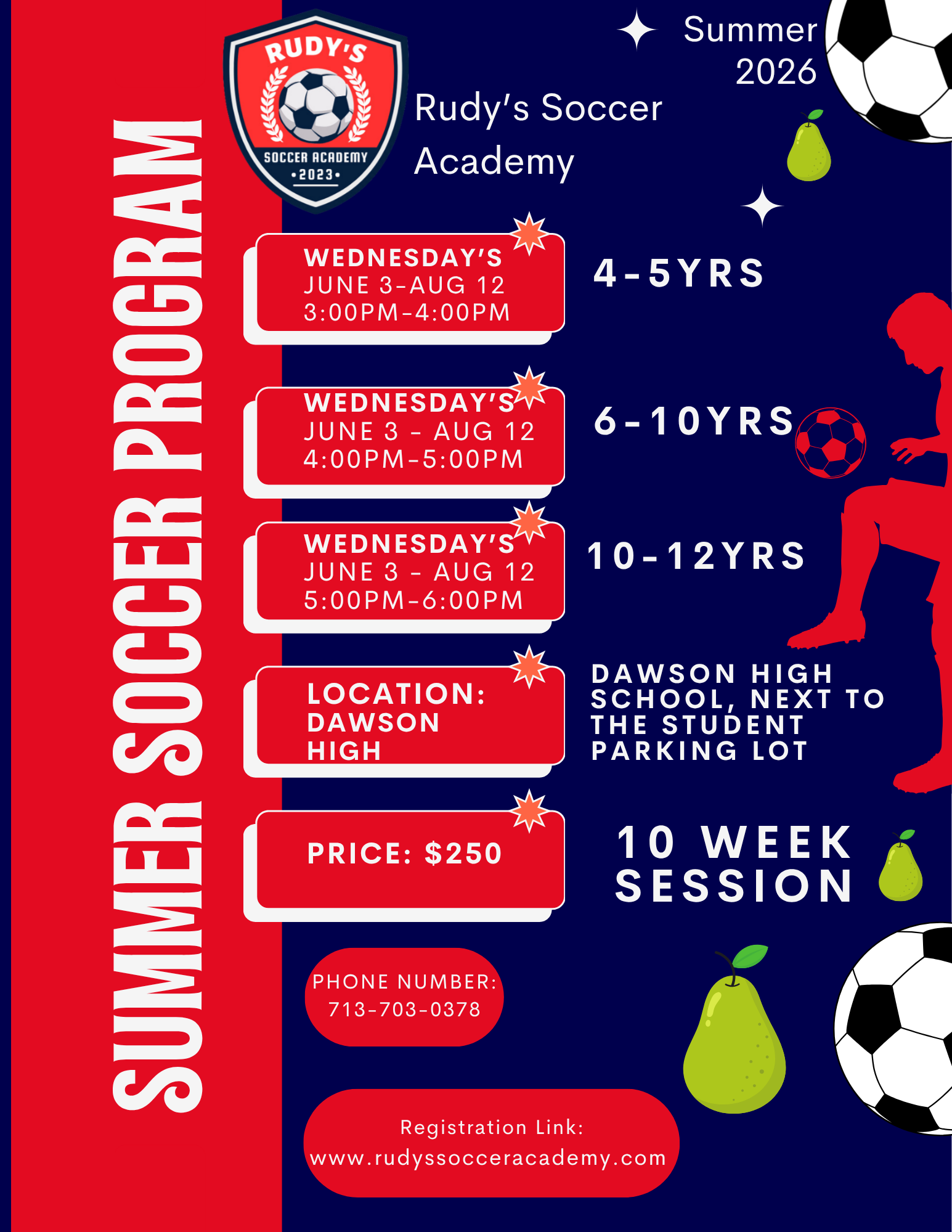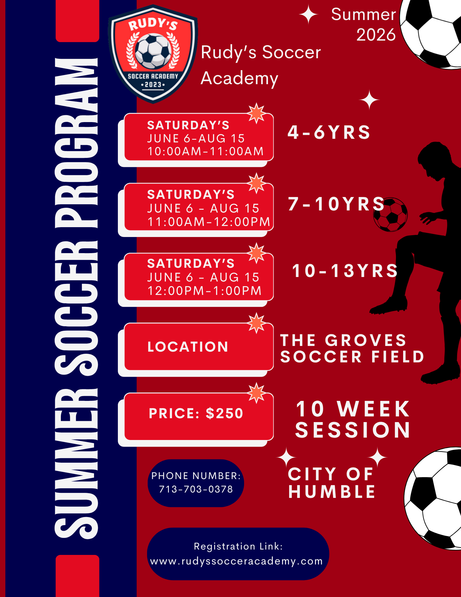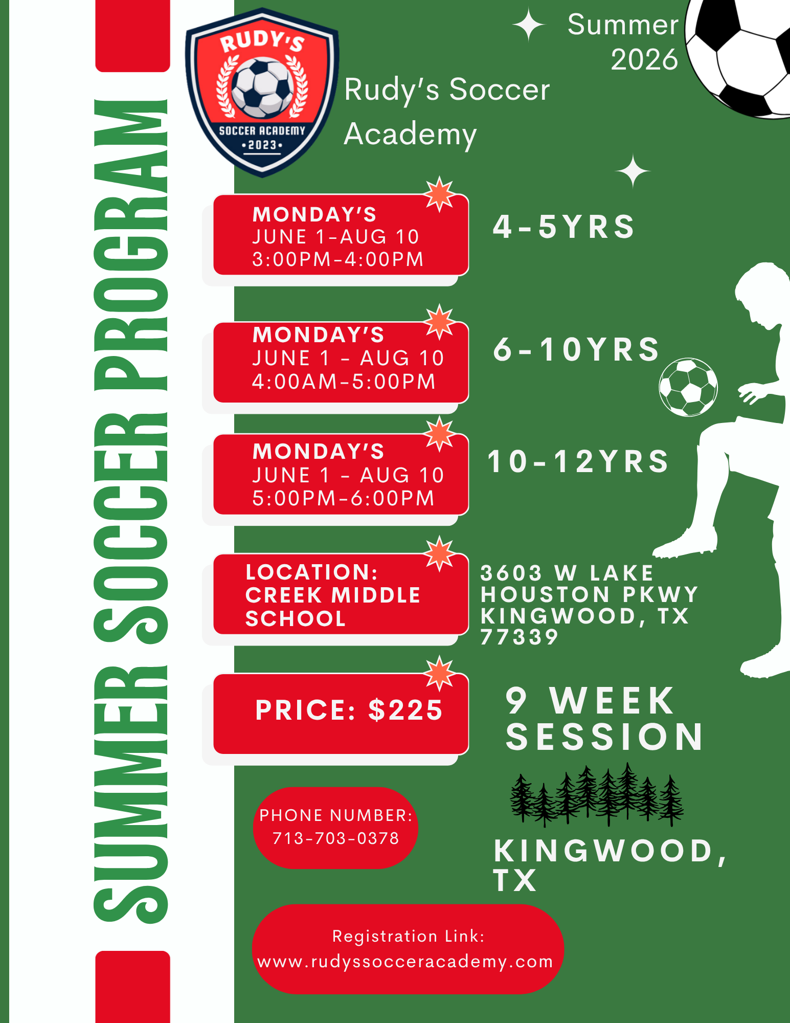 We are excited to bring our 10 week camp back in Atascocita. Camps will teach soccer fundamentals and will finish with a scrimmage amongst the players so they’re able to put the skills learned into practice.
