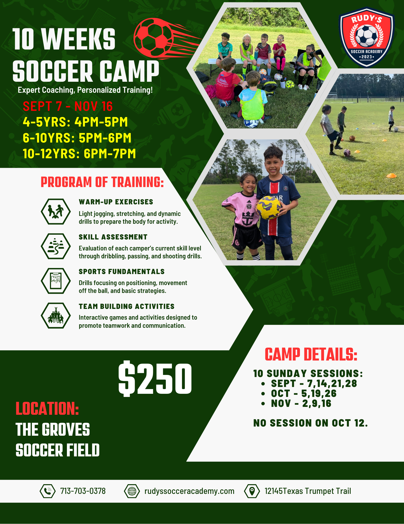 We are excited to bring our 10 week camp to Pearland, Kingwood, and Atascocita. Camps will teach soccer fundamentals and will finish with a scrimmage amongst the players so they’re able to put the skills learned into practice.